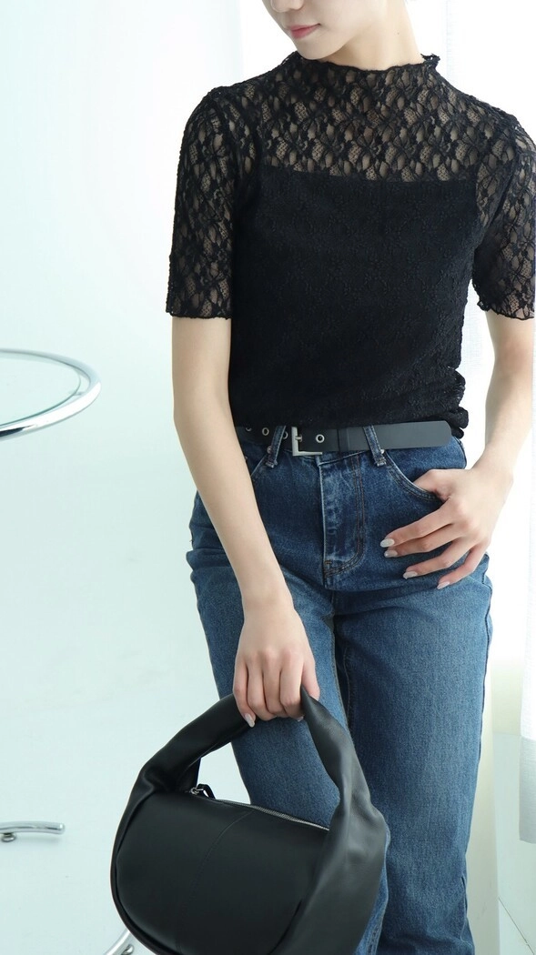 微透膚質感高領短袖【黑色】